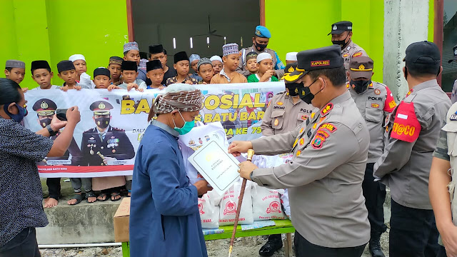 Sebanyak 50 paket sembako yang di bagikan Kapolres bersama rombongan kepada para santri yang sedang menuntut ilmu agama di Pondok Guntur Kedai sianam dan Pesantren Khairul Ummah.dalam rangka menyambut Hari Bhayangakara yang ke- 75.