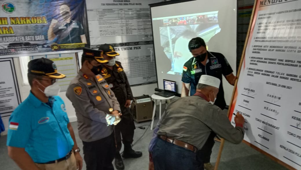 Batu Bara, JournalisNEWS.com – Kapolres Batu Bara AKBP Ikhwan SH MH didampingi Kepala BNNK Kab. Batu Bara AKBP Zainudin S.A.g, Kasat Narkoba AKP Sastrawan SH, para Danramil dan personel Polres Batu Bara juga Kepala Desa serta para tokoh masyarakat mendeklarasikan Desa dan Kampung Bersih Narkoba di Desa Pulau Sejuk Kec. Datuk Lima Puluh Kab. Batu Bara. Selasa sore (29/6/2021).