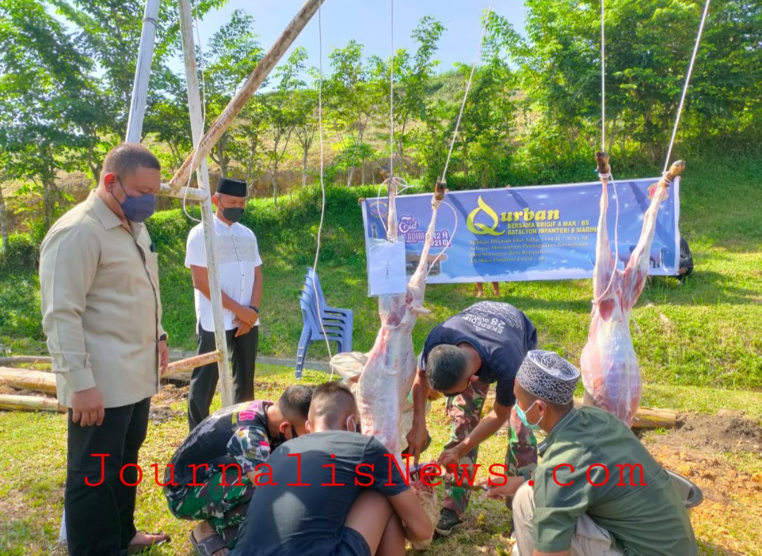 Penyembelihan ini dipimpin langsung oleh Komandan Satuan Yonif 8 Marinir Letnan Kolonel Marinir Farick, M. Tr. Opsla, didampingi Ketua ranting B cabang 7 Jalasenastri PG Kormar Ny. Ade Farick dan kemudian daging qurban tersebut nantinya akan di salurkan kepada yang berhak menerima dan warga yang kurang mampu yang berada di Desa Binaan Yonif 8 Marinir.