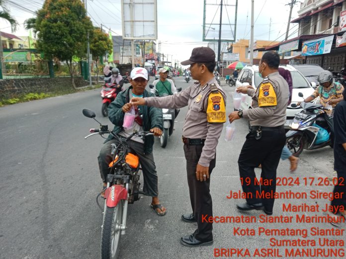 Pematangsiantar, JournalisNews.com – Menjelang berbuka puasa, Bhabinkamtibmas Polsek Siantar Marihat, Polres Pematangsiantar membagikan Takzil kepada masyarakat.