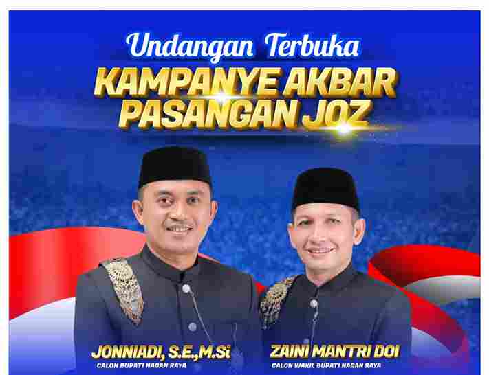 Untuk itu, kami mengajak warga Nagan Raya agar kita hadir sama sama dalam Rangka Kampanye Akbar Pasangan JOZ Pada hari Minggu tanggal 3 November Tahun 2024, mulai pukul 9.30 Wib Sampai dari selesai. Kata Rusli. Kampanye Akbar Pasangan JOZ yang akan dimeriahkan Group Seniman Apache dan turut didampingi tiga rekan lain yakni, Ulem Khaswara, Cut Rani Auliza, dan Joel Keudah. Rabu, 30 Oktober 2024.