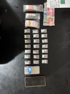 Saat dilakukan penggeledahan, petugas menemukan sejumlah barang bukti yang diduga kuat sebagai barang haram, yaitu 21 (dua puluh satu) bungkus plastik klip sedang diduga berisi Narkotika jenis Sabu berat total (Brutto 32,75 Gram), 1 (satu ) unit Hp Android merk Vivo, 1 (satu) unit timbangan digital, 3 (tiga) bal plastik klip kosong, Uang tunai diduga hasil penjualan Rp 200.000.
