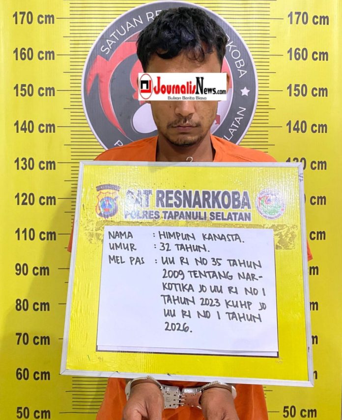 Tapsel, JournalisNews.com – Dalam rangka pencegahan pemberantasan Penyalahgunaan, dan Peredaran Gelap Narkotika (P4GN) satuan reserse narkoba Polres Tapanuli Selatan (Tapsel) berhasil meringkus Himpun Kanasta Pargumbangan warga Desa Pargumbangan (32) Kec. Angkola Muara Tais Kab. Tapanuli Selatan tersangka pengedar daun ganja kering siap edar, Minggu (8/2/2026) sekira pukul 19.30 WIB.